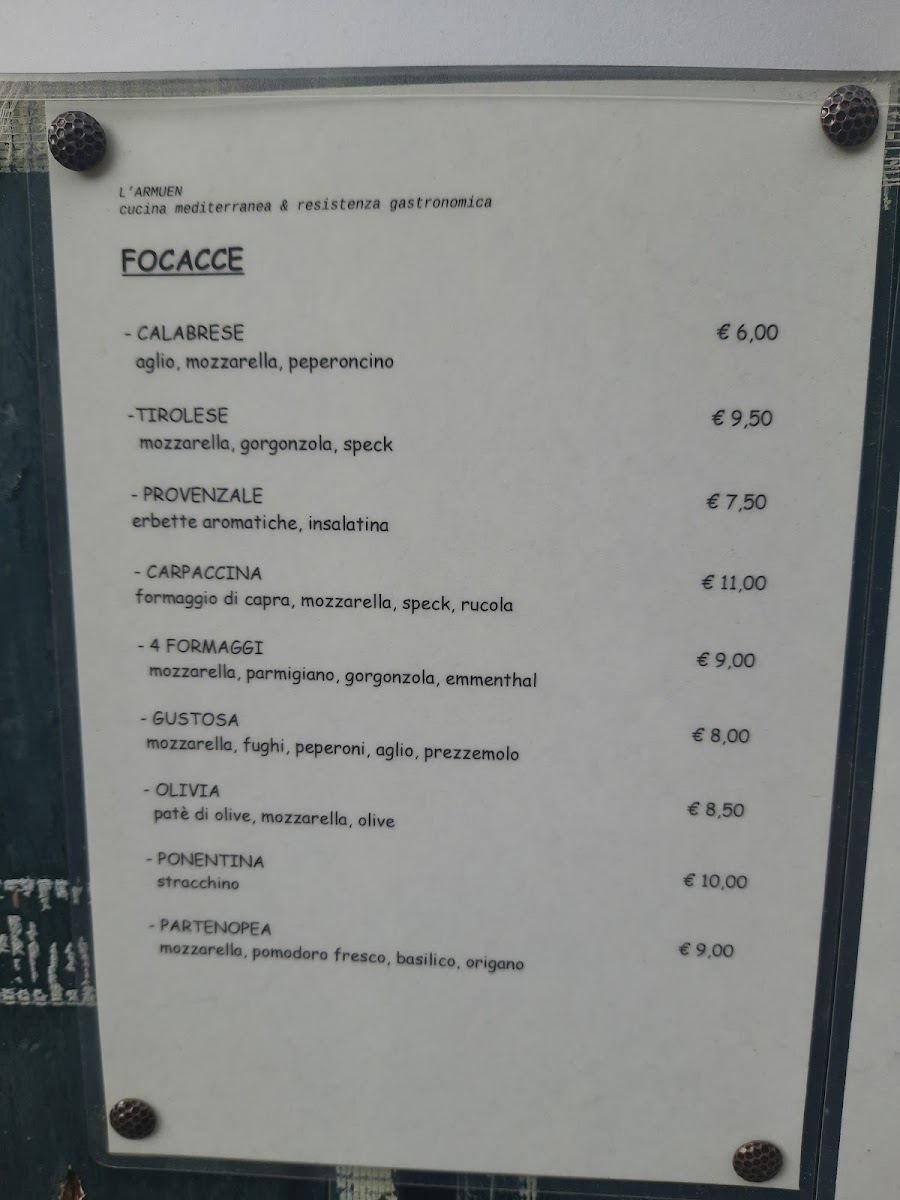 The mixed antipasto is a garden's triumph, featuring crisp vegetables that awaken the palate. The focus is on simple, quality dishes that speak to tradition and passion. Despite its small size and intimate setting, the dedication of the family-run team transforms each meal into an unforgettable experience. L'Armuen is a hidden gem where authenticity, warmth, and Ligurian flavors blend seamlessly, inviting you to savor true Italian comfort food made with love.