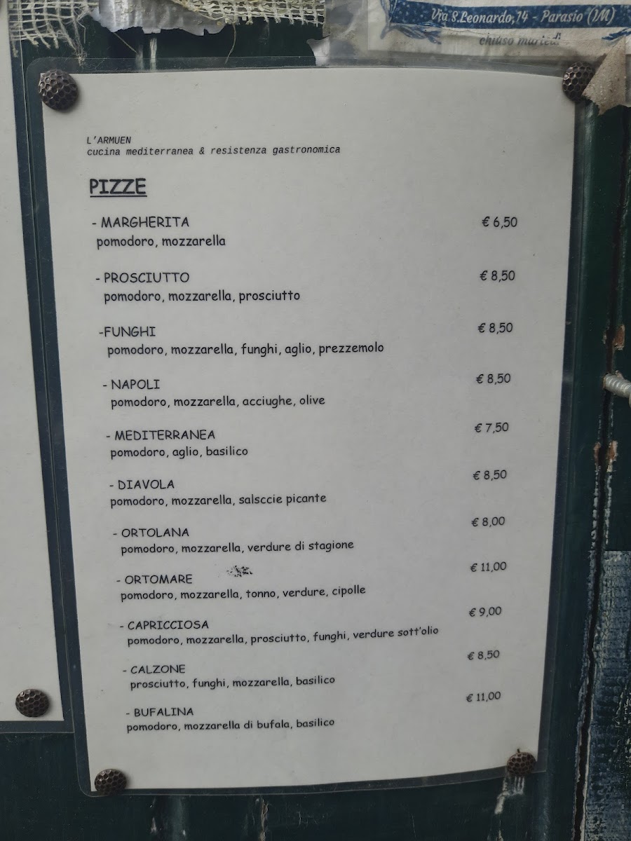 Ristorante Pizzeria L'Armuen offers a heartfelt dive into authentic Ligurian and Italian cuisine, nestled in Imperia's charming Borgo Parasio. The menu centers on handcrafted pizzas, with dough made fresh daily, alongside focaccias and vibrant salads. Highlights include the exceptional Pizza Bufalina, praised for its rich, generous flavors, and the renowned farinata, acclaimed as one of the best in the region. Seasonal ingredients shine through, ensuring every bite captures Liguria’s garden-fresh essence.